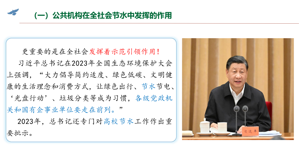 坚持用习近平新时代中国特色社会主义思想统一思想、统一意志、统一行动,认真学习贯彻党的二十届三中全会精神,深入学习习近平总书记考察湖北的重要讲话,牢记习近平总书记殷殷嘱托,砥砺奋进,坚持生态优先、绿色发展,始终从“国之大者”的高度推动生态文明建设,加快建成中部地区崛起的重要战略支点,让美丽湖北、绿色崛起成为湖北高质量发展的重要底色,深刻领会和把握进一步全面深化改革的重大原则和重大举措,特别是关于深化生态文明体制改革的重点任务。深入落实《中共中央、国务院关于加快经济社会发展全面绿色转型的意见》,完整准确全面贯彻新发展理念,加强公共机构能源、水、粮食、资产等各类资源利用的全过程管理和全链条节约,健全公共机构绿色低碳发展机制。贯彻落实中央经济工作会议决策部署,协同推进节能降碳,大力发展公共机构绿色建筑,积极培育公共机构绿色低碳产业,助力经济社会发展全面绿色转型。