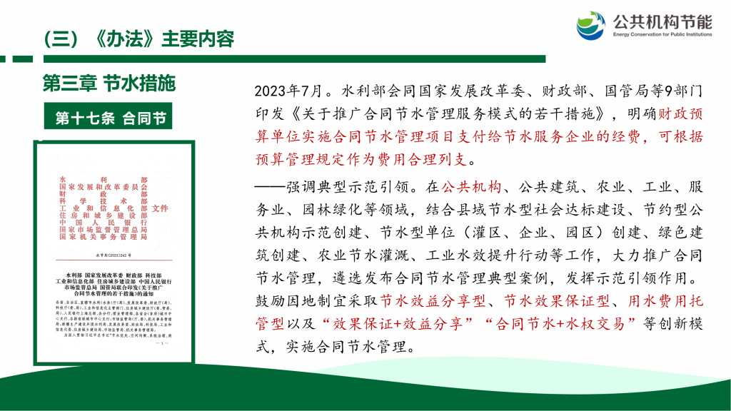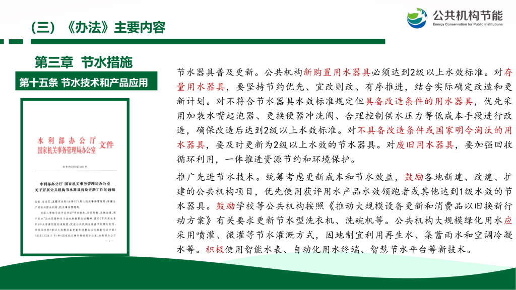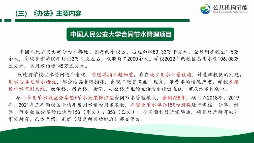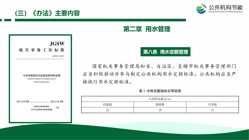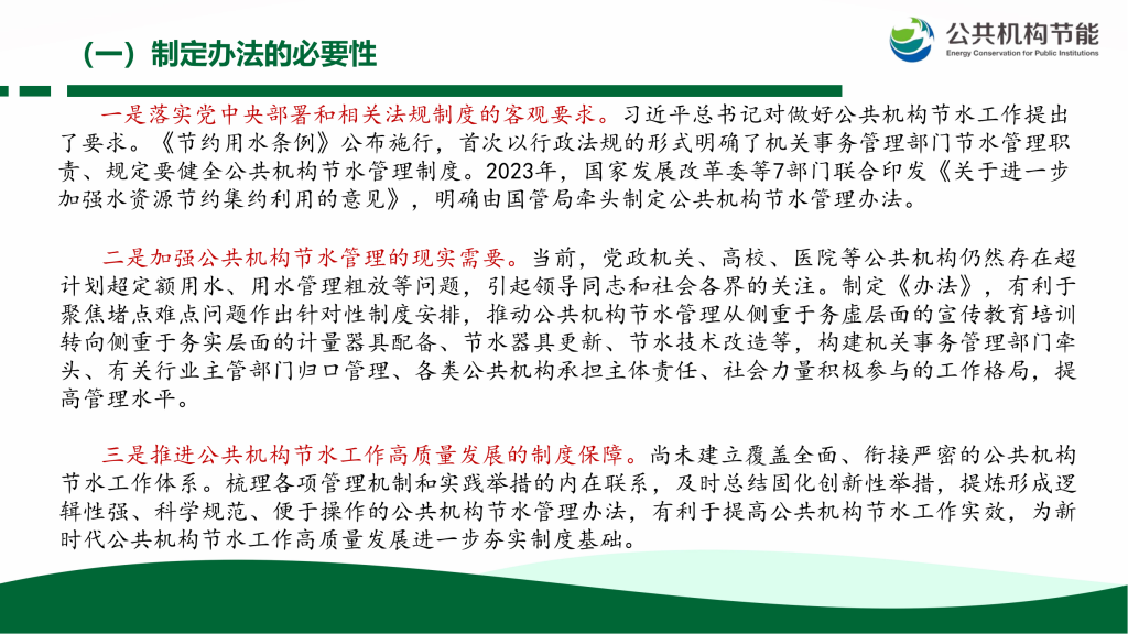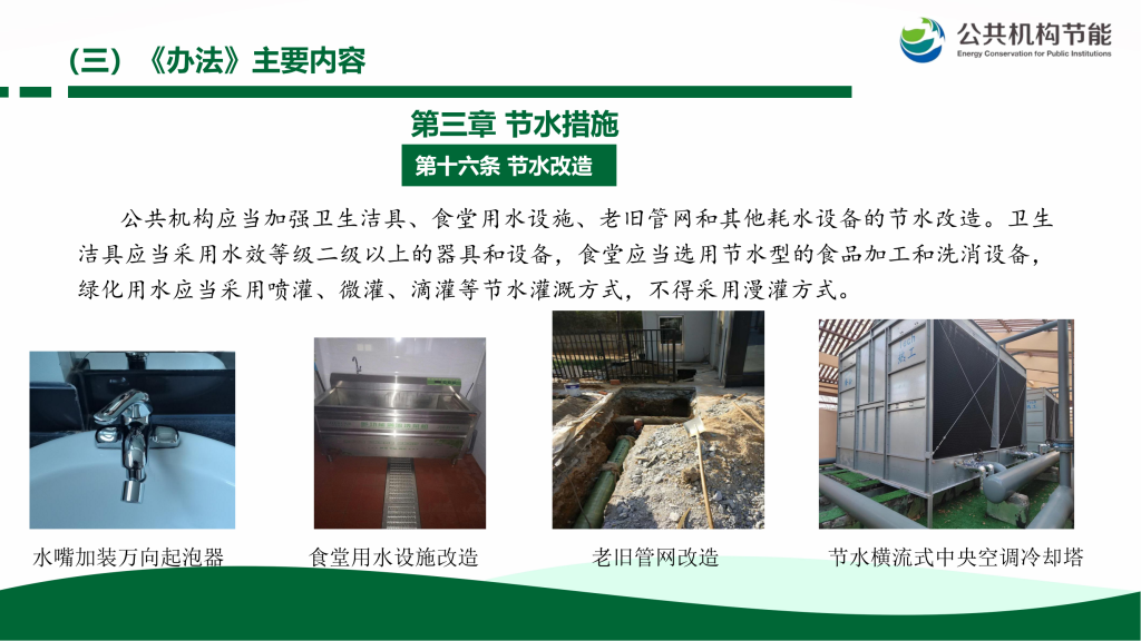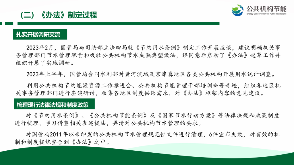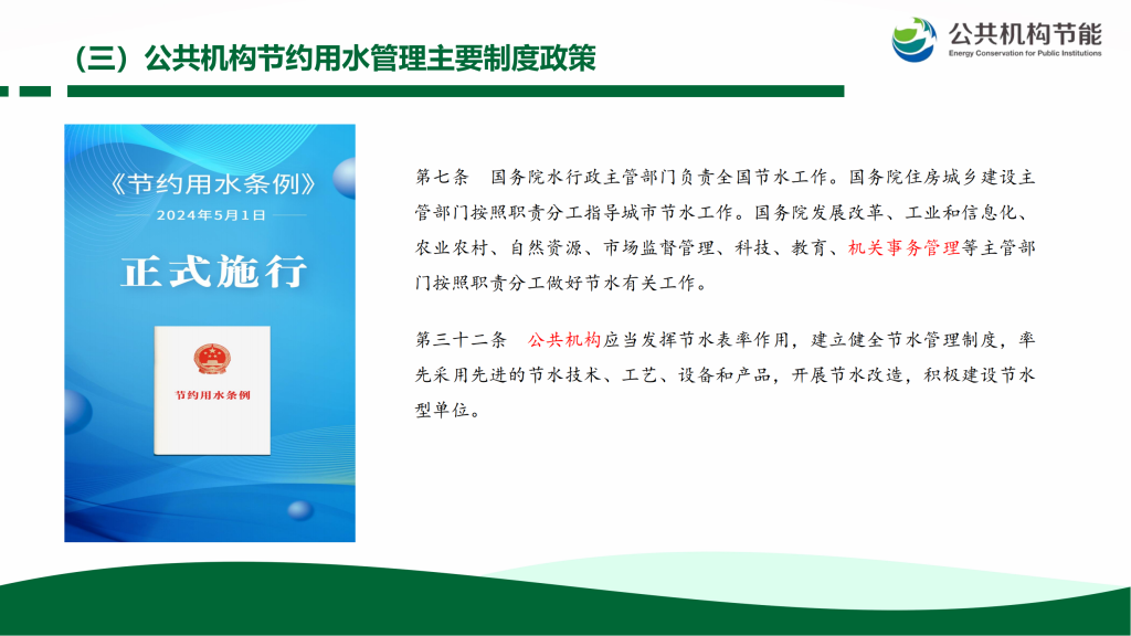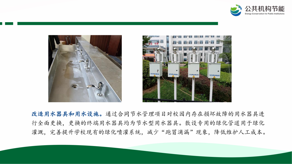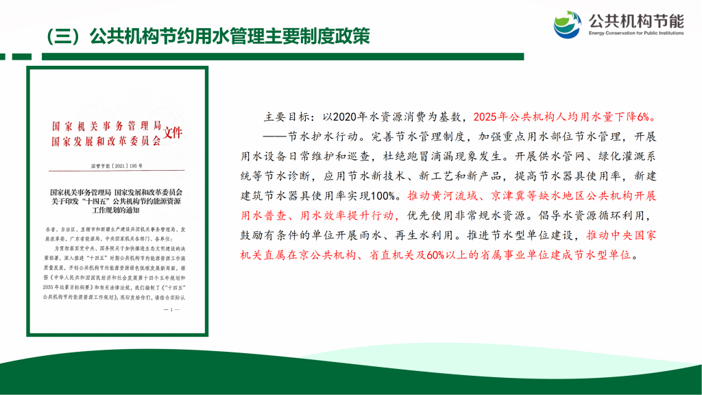 推动公共机构运用合同节水服务的政策文件研究,省机关事务局会同有关部门研究制定公共机构合同节水管理实施规程;编制绿色低碳机关、学校建设规范;制定公共机构节约能源资源督导工作细则。各地区、各部门结合自身实际与需要,及时制定或完善相关制度标准,推动各级公共机构加强能源资源节约理论研究,探索节能管理与资产管理协同发展机制,促进节能与房屋、车辆、办公设备家具等资产管理的融合联动。