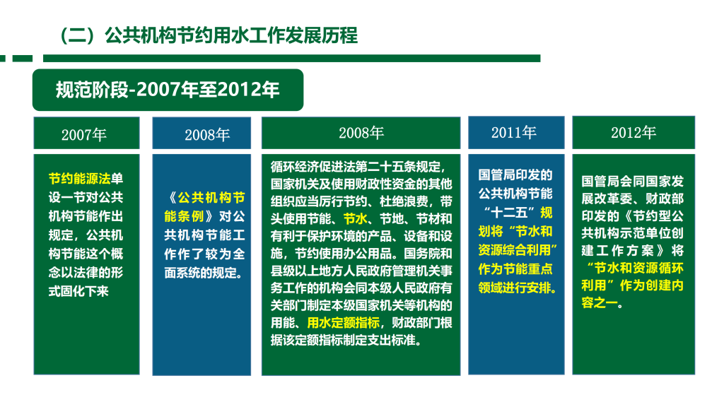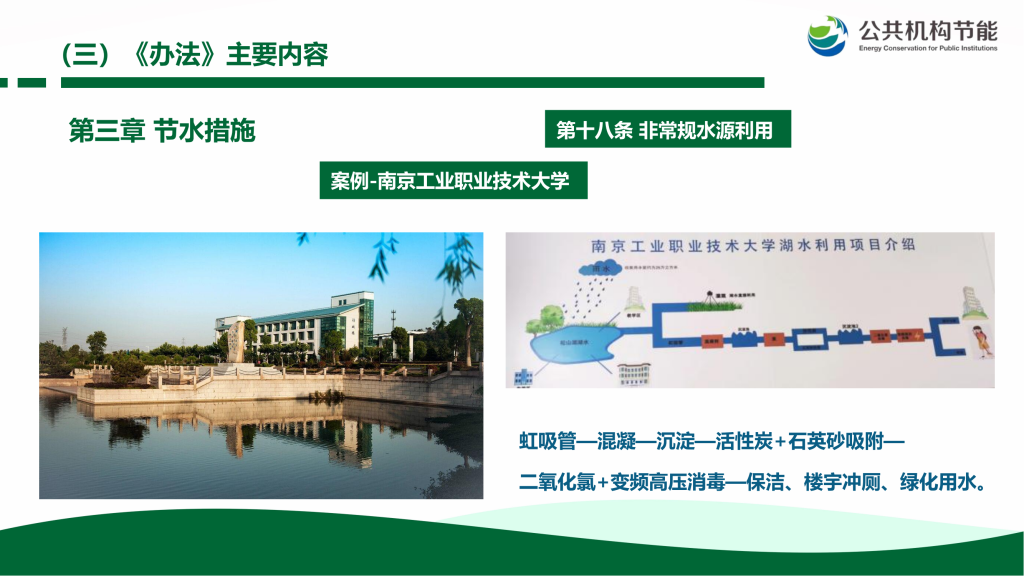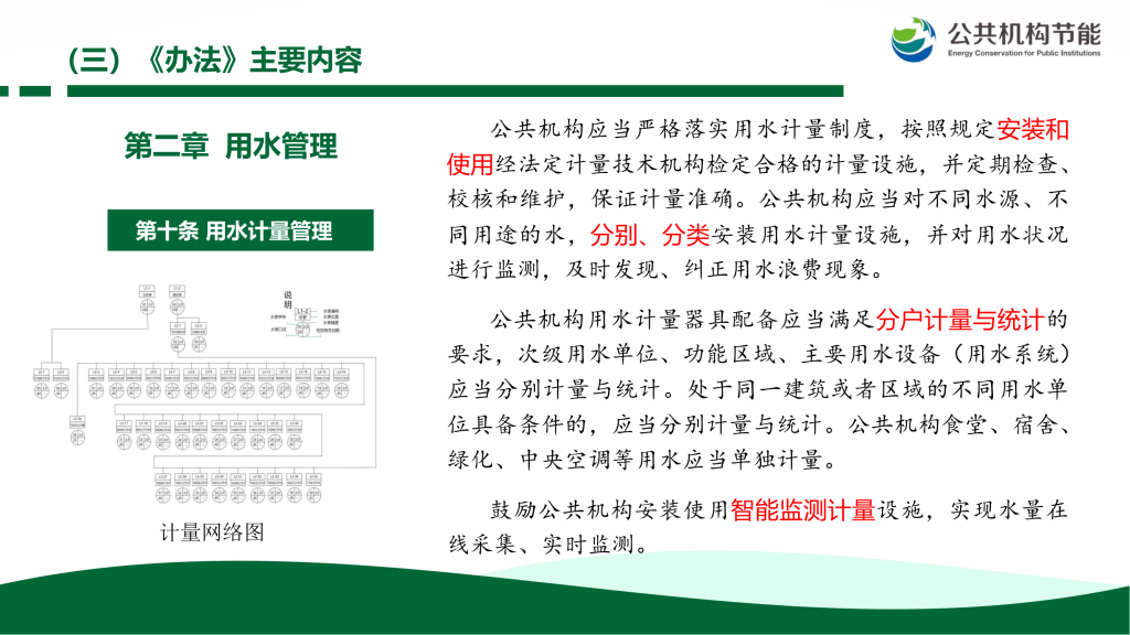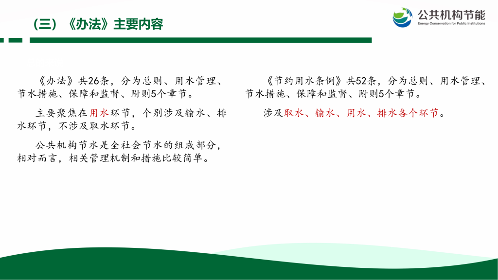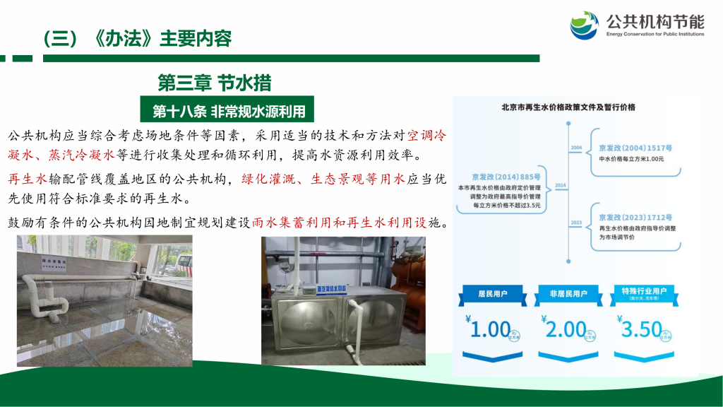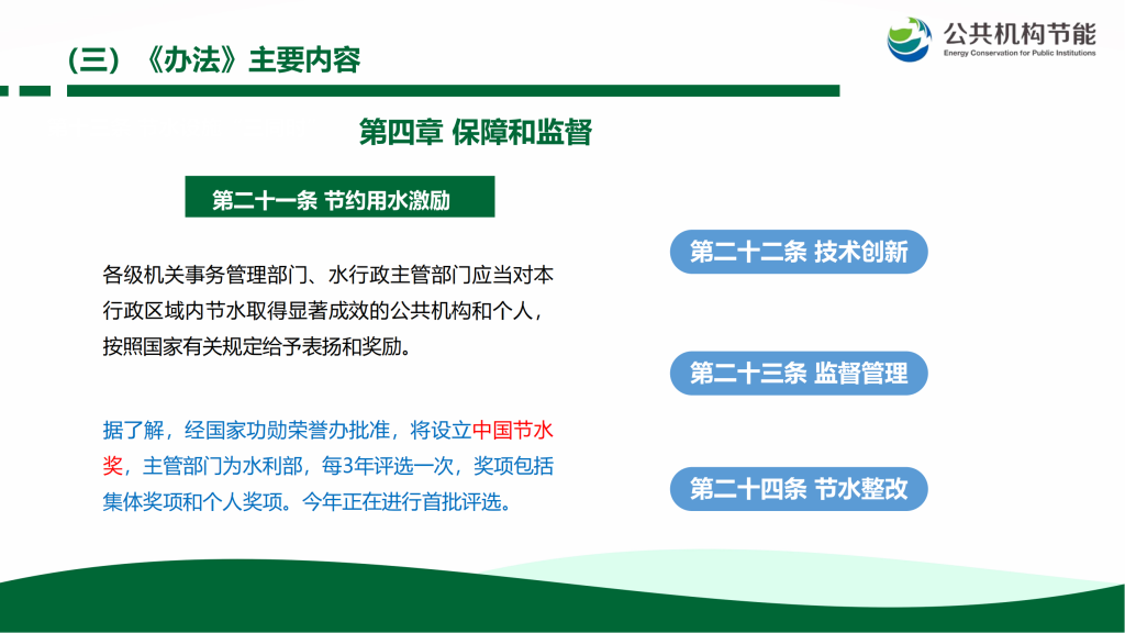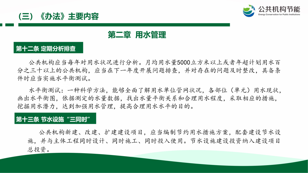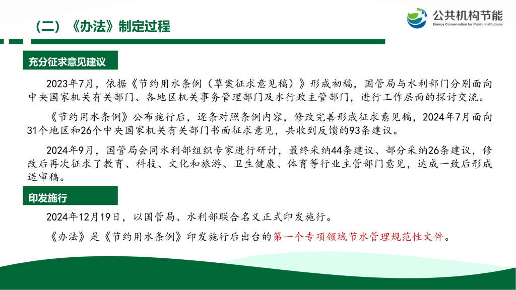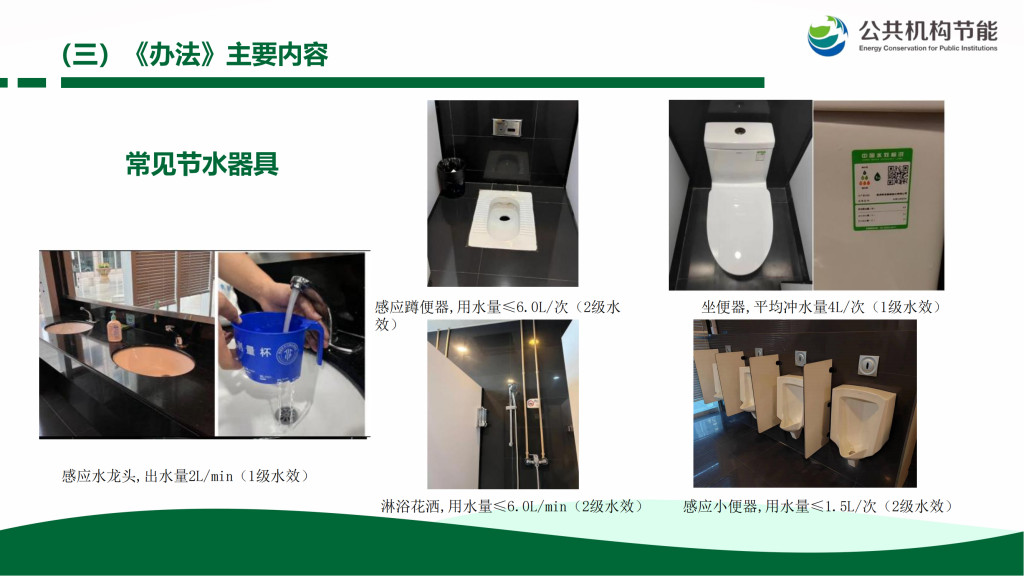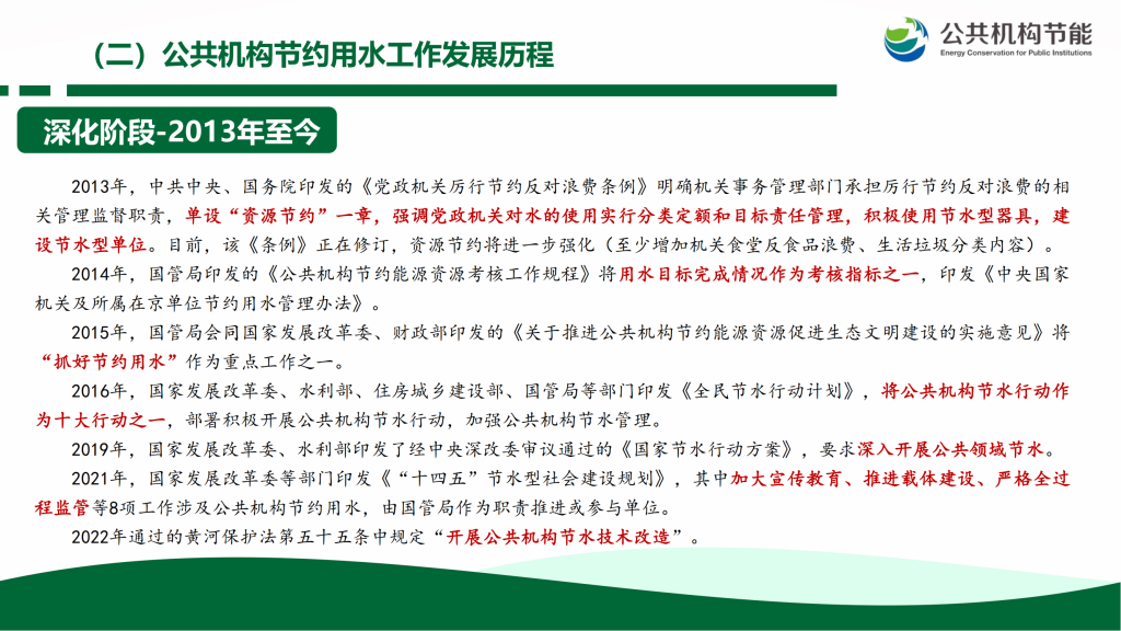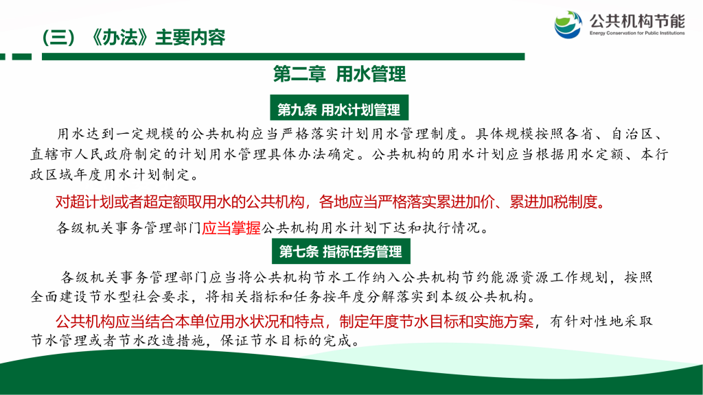 推动公共机构运用合同节水服务的政策文件研究,省机关事务局会同有关部门研究制定公共机构合同节水管理实施规程;编制绿色低碳机关、学校建设规范;制定公共机构节约能源资源督导工作细则。各地区、各部门结合自身实际与需要,及时制定或完善相关制度标准,推动各级公共机构加强能源资源节约理论研究,探索节能管理与资产管理协同发展机制,促进节能与房屋、车辆、办公设备家具等资产管理的融合联动。